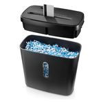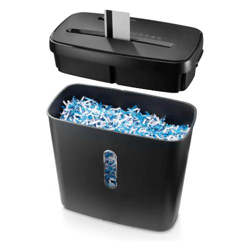 Distruggidocumenti a taglio incrociato per un massimo di 5 fogli di carta A4 DIN (80 g/m²) alla volta; distrugge anche le carte di plastica
