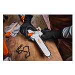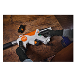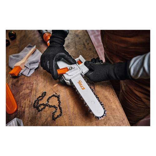 L'efficienza del lavoro è garantita dall'asta telescopica rigida e regolabile in continuo e dal sistema di tensionamento automatico della catena con meccanismo a molla. La tensione della catena può essere regolata rapidamente e senza attrezzi, semplicemente aprendo e chiudendo il coperchio del rocchetto, riducendo al minimo i tempi di fermo. Una leva di tensionamento integrata nel gancio dell'asta facilita il montaggio dell'attrezzo di taglio senza attrezzi dopo la pulizia o la sostituzione della catena.