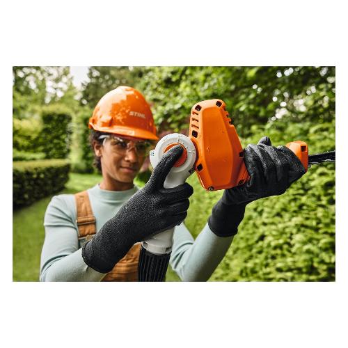 Le lame tagliate al laser, rettificate al diamante e temprate offrono elevate prestazioni di taglio e un funzionamento fluido. La regolazione dell'angolazione della lama senza attrezzi consente di impostare la barra di taglio di 115° (da -45° a +70°) sia per tagli sopra la testa che laterali. Per lavori in prossimità del terreno, la protezione di guida avvitabile protegge l'attrezzo di taglio.
