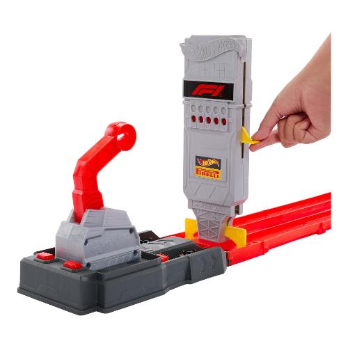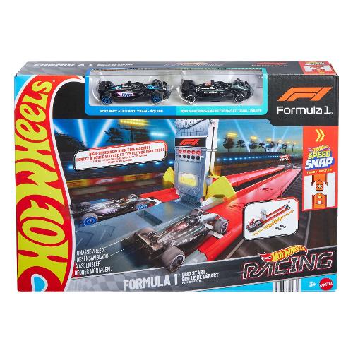 La pista Hot Wheels Race Formula 1 Griglia di Partenza porta a casa tua le emozioni delle corse di F1 con piste per testa a testa e dettagli realistici ispirati alle vere corse del Gran Premio! Carica due macchinine da F1 con licenza ufficiale nel lanciatore, alza la leva sulla torre di partenza e concentrati sul conto alla rovescia: premi il pulsante di lancio e gareggia fino alla fine, quando una bandiera a scacchi decreterà il vincitore. Il set è dotato di componenti con sistema Speed Snap Track per consentire ai bambini di collegare altre piste e set per gare senza fine. Piste aggiuntive in vendita separatamente.
