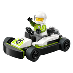 Alimenta il gioco creativo ad alta velocità con il set Go-kart LEGO® City, contenente un veicolo da corsa a basso profilo con pneumatici slick e una minifigure del pilota con casco.