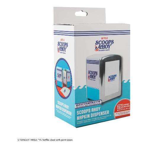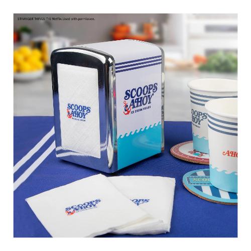 Questo dispenser in latta vintage, adornato con l'iconico logo Scoops Ahoy, emana un fascino retrò. Ogni set include 250 tovaglioli brandizzati Scoops Ahoy, migliorando l'atmosfera di un'esperienza in un vecchio diner american