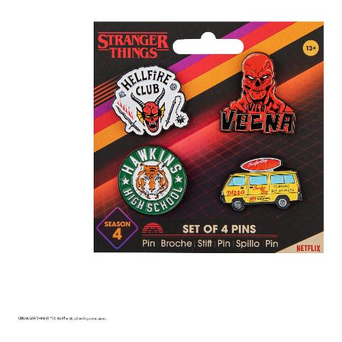 Hellfire Club, Vile Vecna, Hawkins High School e il Pizzamobile compongono la collezione della Stagione 4 di pins di Stranger Things, che completa il set.