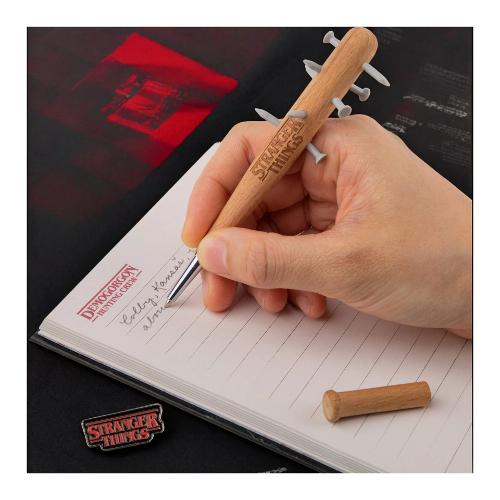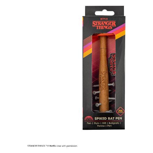 Questa penna è una replica in miniatura dell'iconica Mazza Chiodata della serie, con una lunghezza compatta di 13 cm. Realizzata con attenzione ai dettagli, i chiodi in gomma offrono un tocco realistico senza alcun pericolo reale per l'utente. L'esterno della penna è realizzato in legno, rimanendo fedele al fascino rustico della mazza originale. Per aumentare il suo fascino, ogni penna viene fornita con una spilla esclusiva di Stranger Things, rendendola un oggetto da collezione imperdibile per i fan dello show.