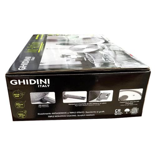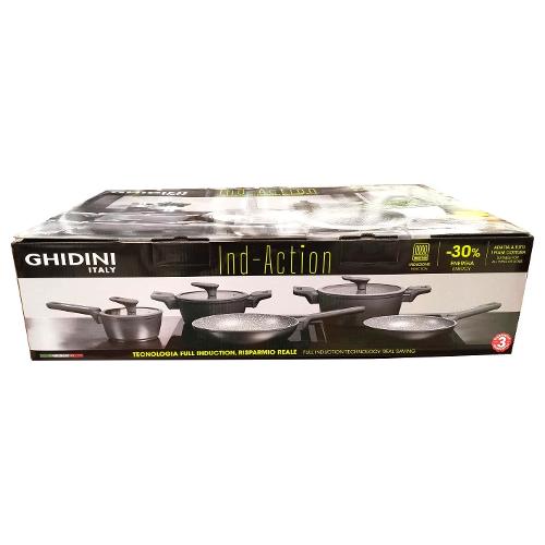 Composizione: Casseruola 2 manici da 20 (2 lt) e 24 cm (4 lt); Casseruola 1 manico da 16 cm (1,2 lt), Padella da 24 e 28 cm e Coperchi in vetro bordo silicone da 16, 20 e 24 cm