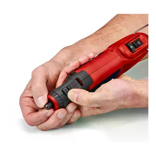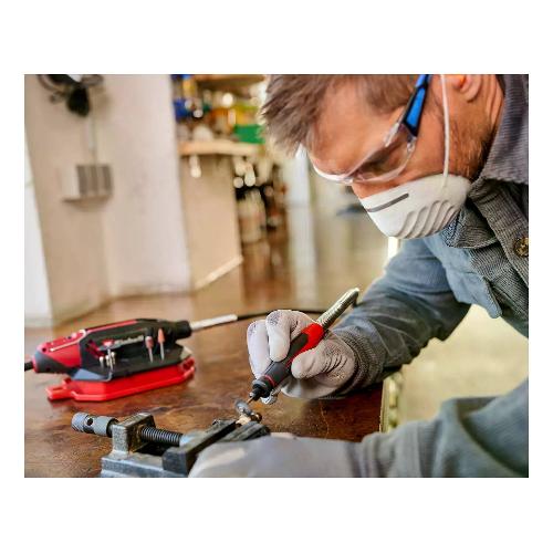 Lo strumento di rettifica e incisione a batteria Einhell TC-MT 150 E è un fedele alleato per svariati lavori come l'incisione, la lucidatura, la fresatura, la rettifica, il taglio e la spazzolatura. Con un'elettronica di velocità a 6 stadi, la potenza può essere adattata in modo flessibile al materiale e alla rispettiva applicazione, consentendo velocità da 10.000 a 35.000 giri al minuto. Il blocco del mandrino consente una sostituzione dell'attrezzo comoda e veloce. Risultati precisi, anche per attività dettagliate o incisioni elaborate, sono resi possibili dalla penna posta sull'asta flessibile di 100 cm. La penna per incisione si adatta perfettamente alla mano grazie alla forma sottile con superfici di presa morbide. Il supporto per dispositivi in dotazione è dotato di un pratico vano per l'asta e la penna, nonché di un supporto per accessori per gli accessori utilizzati di frequente. Lo strumento di rettifica e incisione a batteria può essere appeso alla parete secondo necessità grazie al supporto del dispositivo o posizionato in modo sicuro sul banco di lavoro grazie ai piedini in gomma.