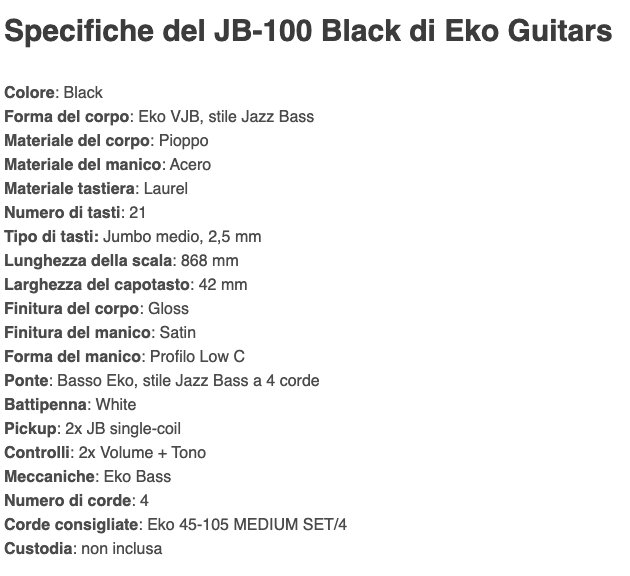 l JB-100 Black è il basso elettrico 4 corde della serie "Tribute 100" di casa Eko Guitars. Ispirato al leggendario Jazz Bass, presenta corpo in Pioppo, manico in Acero e tastiera 21 tasti in Laurel. Monta due pickup JB con controlli separati di Volume e 1 tono. Ideale per il bassista che desidera uno strumento affidabile, versatile e performante.