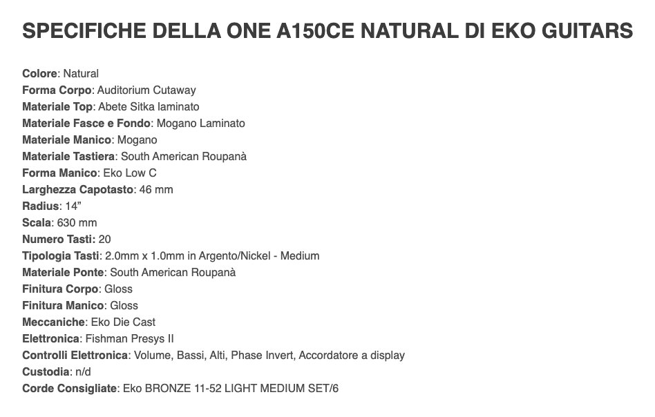 La ONE A150ce Natural è la chitarra acustica elettrificata spalla mancante della serie "ONE" di casa Eko Guitars, amplificata con sistema piezo Fishman Presys II. Presenta top in Abete Sitka laminato, fasce e fondo in Mogano laminato, manico in Mogano e tastiera in South American Roupanà. Ideale sia per il chitarrista amatoriale sia per il professionista che fa attività live e in studio di registrazione.