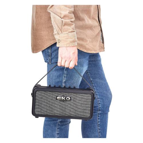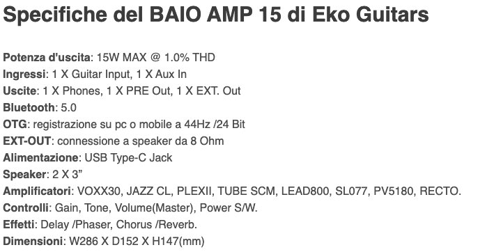 l BAIO AMP 15 è l'amplificatore portatile all-in-one per chitarra elettrica di Eko Guitars che eroga 15W di potenza con due coni da 3". Presenta ingresso per chitarra, otto simulazioni di amplificatori dal clean al distorto, controlli di gain, tono, volume, due sezioni effetto con delay, phaser, chorus, reverb, ingresso aux, uscita cuffie, bluetooth, uscita per speaker esterno, uscita preamplificata, porta USB-C per l'alimentazione e ulteriore uscita USB-C per il collegamento come interfaccia audio.