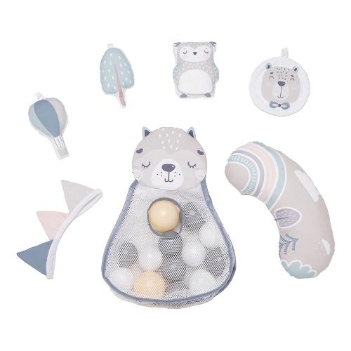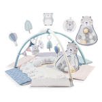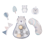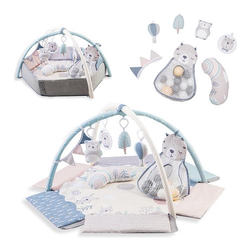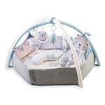 È un prodotto che unisce in sé un tappetino educativo e un morbido box con bordi alzabili, che lo trasformano in una piscina a secco di palline. Include cestino a forma di animale per le palline color pastello, 2 soffici archi gioco con 4 giocattoli facilmente appendibili, 1 ghirlanda frusciante, 1 cuscino ergonomico per il gioco a pancia in giù. Facile da piegare e trasportare è anche lavabile in lavatrice