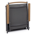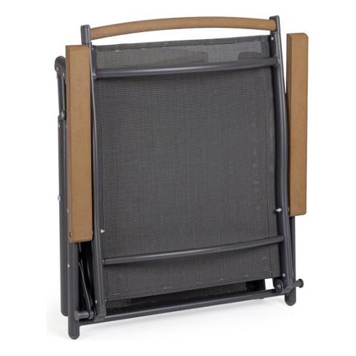 Struttura in alluminio verniciata a polvere (Poliestere). Braccioli e barra schienale con inserti in polyWood(materiale composito dall'aspetto simile al legno). Seduta e schienale in textilene 2x1. Schienale reclinabile in 5 posizioni, poggiapiedi reclinabile in 3 posizioni. Pieghevole