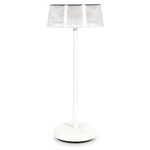 Policarbonato, ABS e metallo, paralume in policarbonato. Lampada led, luce dimmerabile, ricaricabile con cavo usb 1 mt incluso. Tasto on/off touch. Per uso interno ed esterno, IP44