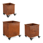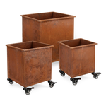 L'acciaio non è verniciato ma naturalmente ossidato, il che vuol dire che il colore dell'articolo si modifica naturalmente a contatto con acqua e altri agenti atmosferici creando un effetto ruggine autentico. Con ruote. Solo per uso esterno.
