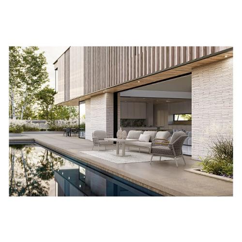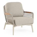 Struttura in alluminio verniciata a polvere (Poliestere). Braccioli con inserti in teak. Seduta con intreccio in corda Olefin. Cuscini sfoderabili con tessuto idrorepellente Olefin (100% polipropilene). Viteria in acciaio inossidabile. Gambe da assemblare