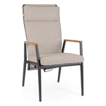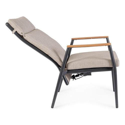 Struttura in alluminio verniciata a polvere (Poliestere). Braccioli con inserti in teak. Schienale (con intreccio in corda Olefin) ,reclinabile in libera posizione e seduta in textilene 1x1,Cuscini sfoderabili con tessuto idrorepellente Olefin (100% polipropilene)