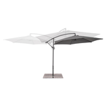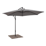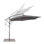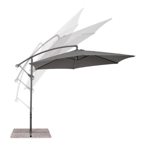 Struttura in acciaio verniciata a polvere(Poliestere). Palo D. 48mm. Palo sospeso D. 42mm. 6 stecche 12x18mm. Telo color grigio scuro in Poliestere 160gr/m2 con camino antivento. Base a croce in acciaio. Palo girevole 360°manualmente. Marmette non incluse