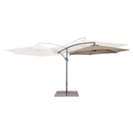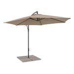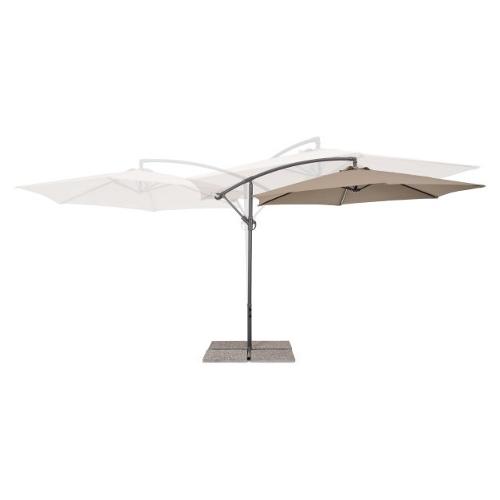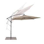 Struttura in acciaio verniciata a polvere(Poliestere). Palo D. 48mm. Palo sospeso D. 42mm. 6 stecche 12x18mm. Telo color tortora in Poliestere 160gr/m2 con camino antivento. Base a croce in acciaio. Palo girevole 360°manualmente. Marmette non incluse