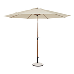 Struttura in acciaio trattato per esterno tramite fosfatazione e verniciato a polvere (Poliestere) effetto legno. Palo D. 38mm con snodo zincato. 8 stecche 9x16mm. Telo in Poliestere color bianco 180gr/m2 filato a t. Con carrucola e camino antivento. Base non inclusa