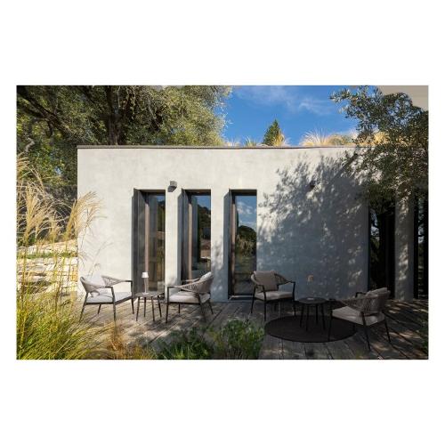 Struttura in alluminio verniciata a polvere (Poliestere). Intreccio per esterno in corda Poliestere. Piano in pietra sinterizzata (pietra naturale lavorata ad elevate temperature) (spessore 11mm). Cuscini sfoderabili in tessuto idrorepellente 100% Poliestere. Viteria in acciaio inossidabile. Poltrona impilabile. Tavolino da assemblare