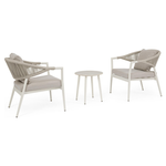 Struttura in alluminio verniciata a polvere (Poliestere). Intreccio per esterno in corda Poliestere. Piano in pietra sinterizzata (pietra naturale lavorata ad elevate temperature) (spessore 11mm). Cuscini sfoderabili in tessuto idrorepellente 100% Poliestere. Viteria in acciaio inossidabile. Poltrona impilabile. Tavolino da assemblare