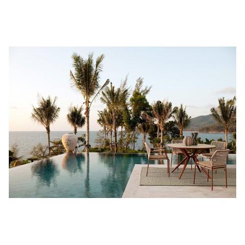 Struttura in alluminio verniciata a polvere (Poliestere). Intreccio per esterno in corda Poliestere. Impilabile