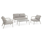Struttura in alluminio verniciata a polvere (Poliestere). Intreccio per esterno in corda Poliestere. Piano in pietra sinterizzata (pietra naturale lavorata ad elevate temperature) (spessore 11mm). Cuscini sfoderabili in tessuto idrorepellente 100% Poliestere. Viteria in acciaio inossidabile. Tavolino da assemblare