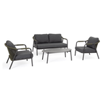 Struttura in alluminio verniciata a polvere (Poliestere). Intreccio per esterno in corda Olefin (polipropilene). Piano in pietra sinterizzata (pietra naturale lavorata ad elevate temperature) (spessore 11mm). Cuscini sfoderabili in tessuto idrorepellente 100% polipropilene. Viteria in acciaio inossidabile. Tavolino da assemblare