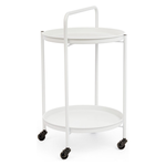 Acciaio trattato per esterno (e-coating) e verniciato a polvere (Poliestere) con finitura opaca. Vassoi removibili e gambe pieghevoli. Provvisto di quattro ruote