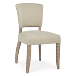 Struttura in legno di frassino con finitura a base di nitrocellulosa, rivestimento in tessuto (15% Poliestere 85% cotone). Schienale con applicazione di borchie in metallo. Imbottitura in schiuma poliuretanica Densità seduta 30kg/m3, schienale 25kg/m3