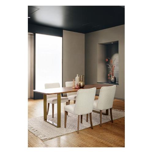 Struttura in legno di quercia. Rivestimento in Poliestere effetto bouclè. Schienale con applicazione di borchie in metallo. Densità imbottitura in schiuma poliuretanica seduta 30kg/m3, schienale 25kg/m3