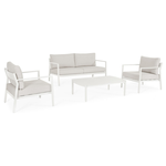 Struttura in alluminio verniciato a polvere (Poliestere). Cuscini seduta e schienale sfoderabili con tessuto idrorepellente Spunpoly (100% Poliestere). Piedini regolabili. Gambe tavolino (viteria in acciaio inossidabile) da assemblare