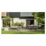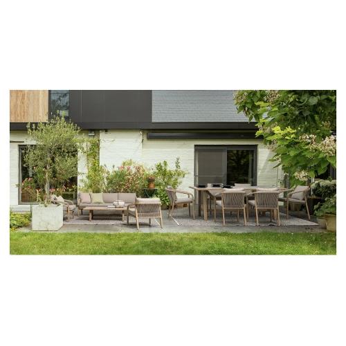 Alluminio verniciato a polvere (Poliestere) effetto legno. Schienale e braccioli con intreccio in corda di Poliestere (tonda 5mm). Cuscini seduta e schienale sfoderabili con tessuto idrorepellente Olefin (100% polipropilene). Impilabile