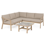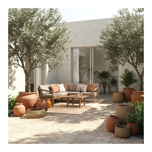 Alluminio verniciato a polvere (Poliestere) effetto legno. Piano tavolino con mattonelle in porcellana smaltata (provenienza Spagna). Schienale e braccioli con intreccio in corda di Poliestere (tonda 5mm). Cuscini seduta e schienale sfoderabili con tessuto idrorepellente Olefin (100% polipropilene). Viteria in acciaio inossidabile. Da assemblare