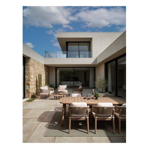 Struttura in legno di acacia FSC 100%, finitura a olio (effetto teak). Schienale in alluminio con intreccio in corda (Poliestere). Cuscini sfoderabili in tessuto idrorepellente Olefin (100% polipropilene). Viteria galvanizzata. Piedini regolabili tavolini con gambe da assemblare