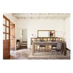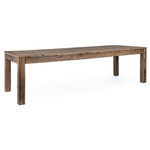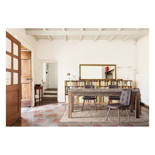 Legno di olmo riciclato, piano con lavorazione anticata a parquet. Finitura a base di nitrocellulosa. Gambe da assemblare