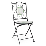 Struttura in acciaio trattato per l'esterno (e-coating) e verniciato a polvere epossidica. Seduta e schienale con decoro in ceramica. Pieghevole