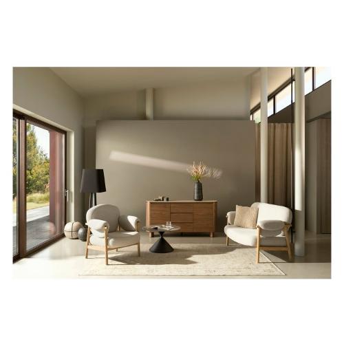 Struttura in legno di betulla. Rivestimento in Poliestere. Imbottitura in schiuma poliuretanica (Densità 25kg/m3 seduta, 22kg/m3 schienale). Braccioli removibili. Gambe da assemblare