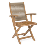 Legno di acacia FSC 100%, finitura a olio (effetto teak). Schienale con intreccio in corda di polipropilene. Viteria e sistema blocco seduta in acciaio galvanizzato