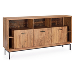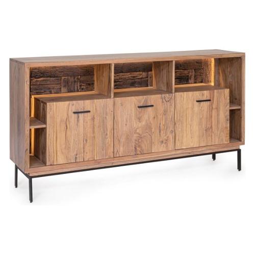 Struttura in legno di acacia, schienali in compensato, interno a vista in legno riciclato. Finitura acrilica protettiva. Ante con cerniera chiusura ammortizzata. Maniglie e gambe in acciaio. Vano porta comprensivo di mensola. Gambe da assemblare