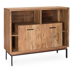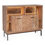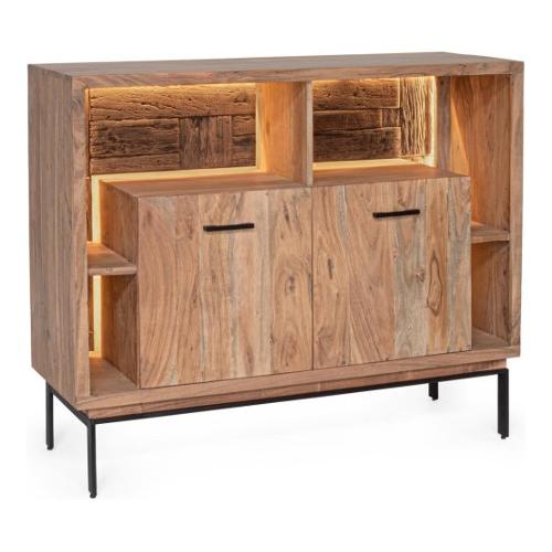Struttura in legno di acacia, schienali in compensato, interno a vista in legno riciclato. Finitura acrilica protettiva. Ante con cerniera chiusura ammortizzata. Maniglie e gambe in acciaio. Vano porta comprensivo di mensola. Gambe da assemblare