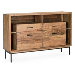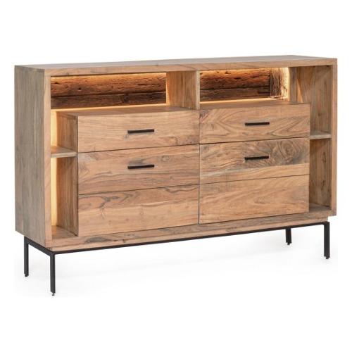 Struttura in legno di acacia, schienali in compensato, interno a vista in legno riciclato. Finitura acrilica protettiva. Ante con cerniera chiusura ammortizzata. Maniglie e gambe in acciaio. Gambe da assemblare