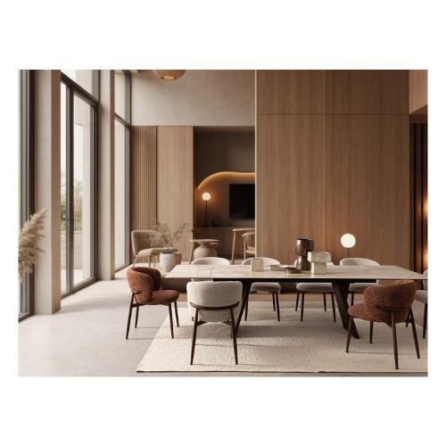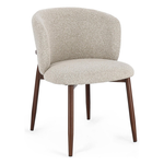 Struttura in acciaio verniciato a polvere epossidica, effetto legno. Seduta e schienale con rivestimento in Poliestere, effetto bouclè. Densità imbottitura in schiuma poliuretanica seduta 24-28kg/m3, schienale 22-24kg/m3. Impilabile