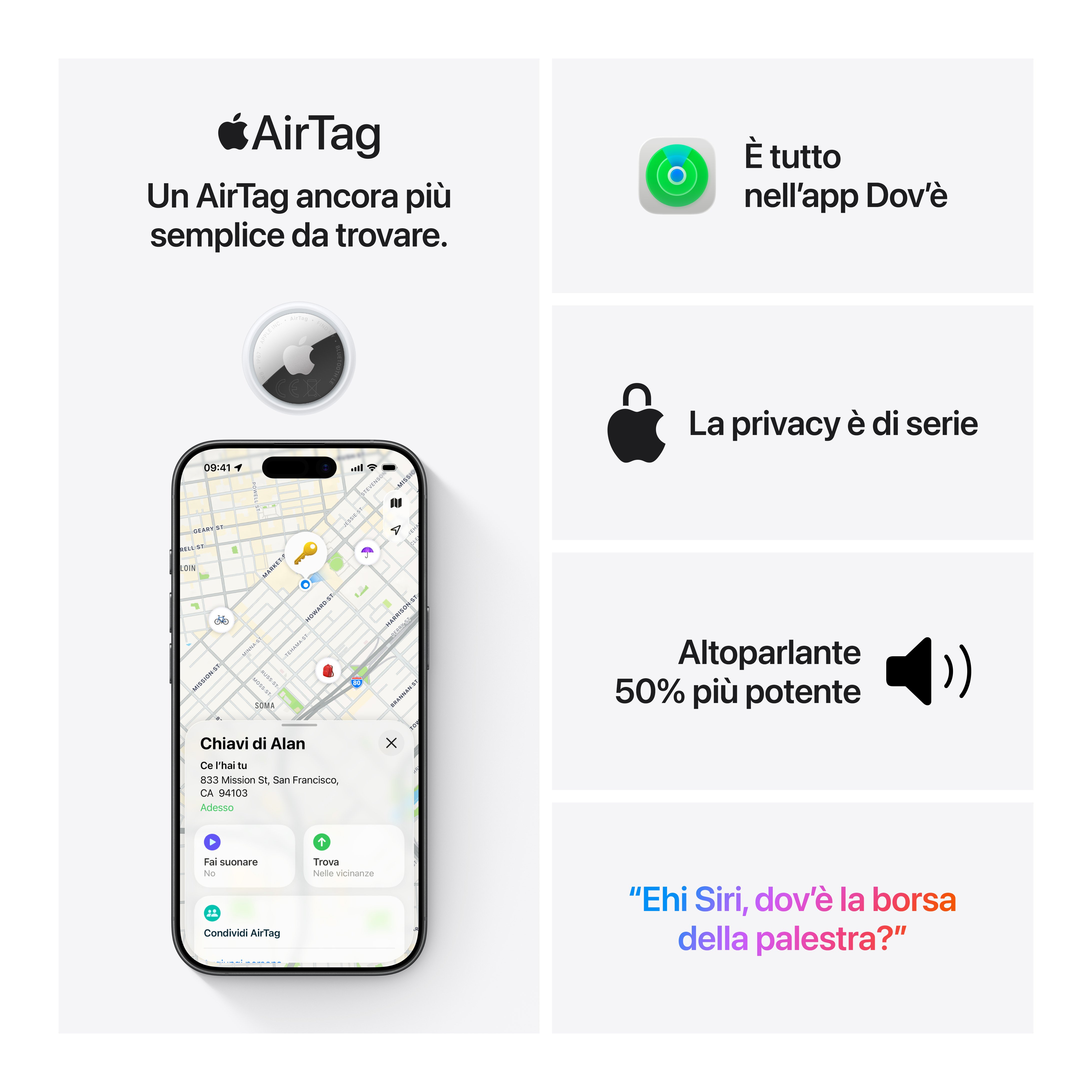 AirTag (seconda generazione) ora ha un altoparlante ancora più potente e un raggio d’azione più ampio per la funzione “Posizione precisa”: così trovare i tuoi oggetti è più semplice che mai. Batteria a bottone CR2032 sostituibile dall’utente