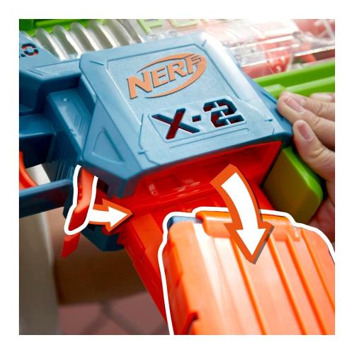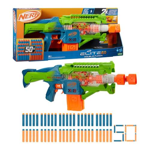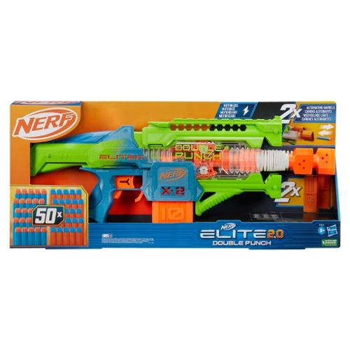 Blaster motorizzato Nerf elite 2.0 double punch dotato di canne con alternazione rapida: doppia canna che si muovono rapidamente avanti e indietro mentre lanci. Doppio caricatore! Carica entrambi i caricatori da 10 dardi sul blaster giocattolo per lanciare ben 20 dardi durante sfide all'aperto o al chiuso. Dotato di un motore interno che ti permette di lanciare i dardi velocemente. Include 50 dardi nerf elite 2.0 in 2 colori. Si consiglia ai giocatori e alle persone all'interno del raggio d'azione del blaster di indossare gli occhiali protettivi. Utilizzare esclusivamente dardi Nerf originali. Dardi diversi potrebbero non soddisfare i requisiti di sicurezza. Non modificare né il blaster né i dardi.