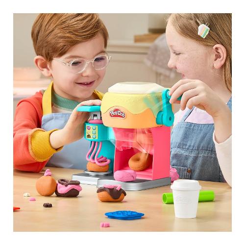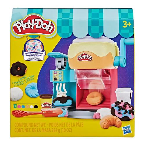 Contiene: playset, tazza di caffè con coperchio, stampo a forma di croissant, stampino per glassa, spatola, rullo e 5 vasetti di pasta modellabile a marchio Play-Doh (284 in totale).