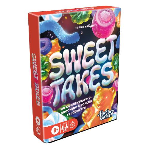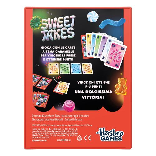 Sweet Takes di Hasbro Gaming offre un divertimento delizioso per tutta la famiglia! Questo gioco di strategia con carte per bambini, bambine e adulti è ricco di trucchi e dolcetti, e si svolge in 12 turni veloci. A ogni turno, i giocatori giocano una carta dalla loro mano o dalla loro scorta segreta. La carta del primo giocatore determina il seme che tutti gli altri devono abbinare, se ci riescono. Gioca la carta più alta di un seme per prendere tutte le carte di quel seme e guadagnare punti. Vince il giocatore che ha accumulato più punti al termine della partita con familiari e amici! Gioca a questo gioco per feste in coppia o fino a un massimo di 5 giocatori. I giochi per famiglie con le carte sono ideali per i viaggi, per le serate a tema e per qualsiasi altra occasione in compagnia. Inoltre, il gioco portatile Sweet Takes è un fantastico regalo per bambini, bambine e adulti che adorano i giochi di carte pratici, veloci e compatti.