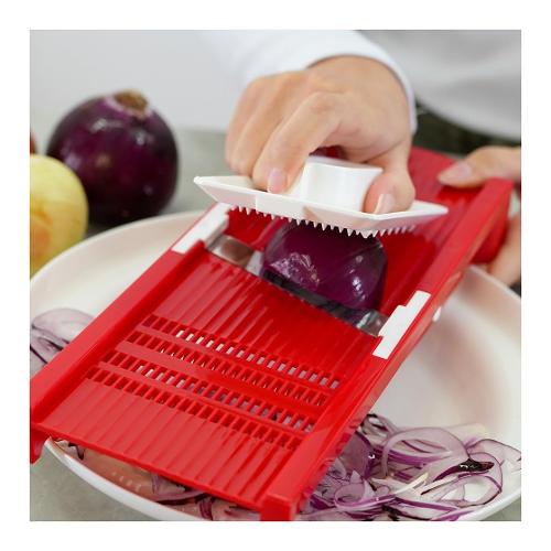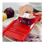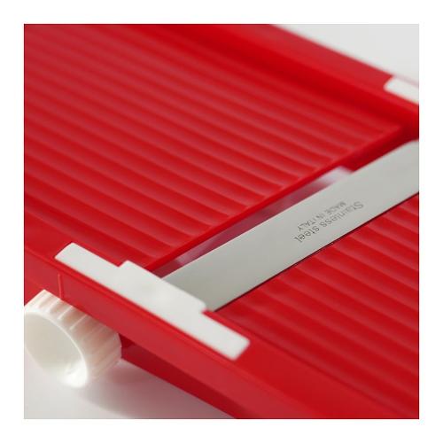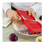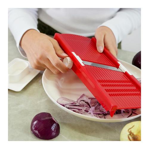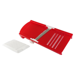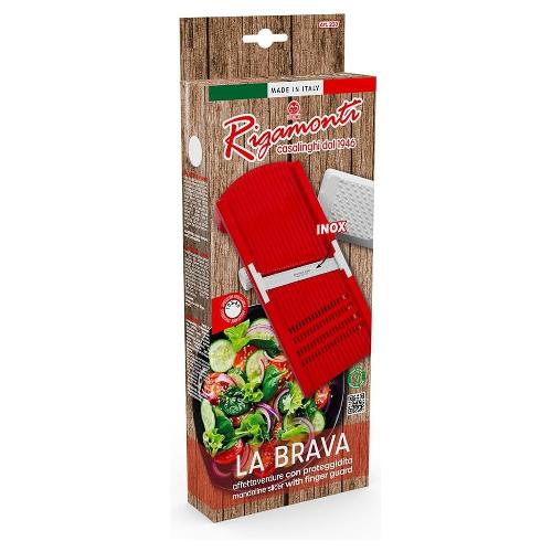 Mandolina affettaverdure"La Brava" con corpo in polipropilene, lama in acciaio inox temperata e affilata, tampone proteggi dita in polistirene. È possibile variare lo spessore del taglio in 5 diverse misure tramite apposita rotella. Adatta per affettare a dischetto oppure a foglia. Lavabile in lavastoviglie.