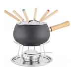 Il set è composto da: 1 pentolino acciaio, 1 coperchio paraspruzzi ghisa, 1 rechaud cromato, 6 forchette, 1 bruciatore per pasta combustibile, 1 ricettario.
