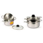 Set cottura a vapore composto da 1 casseruola Daisy con fondo adatto per induzione, 1 cestello basso e 1 coperchio vetro con bordo in acciaio.