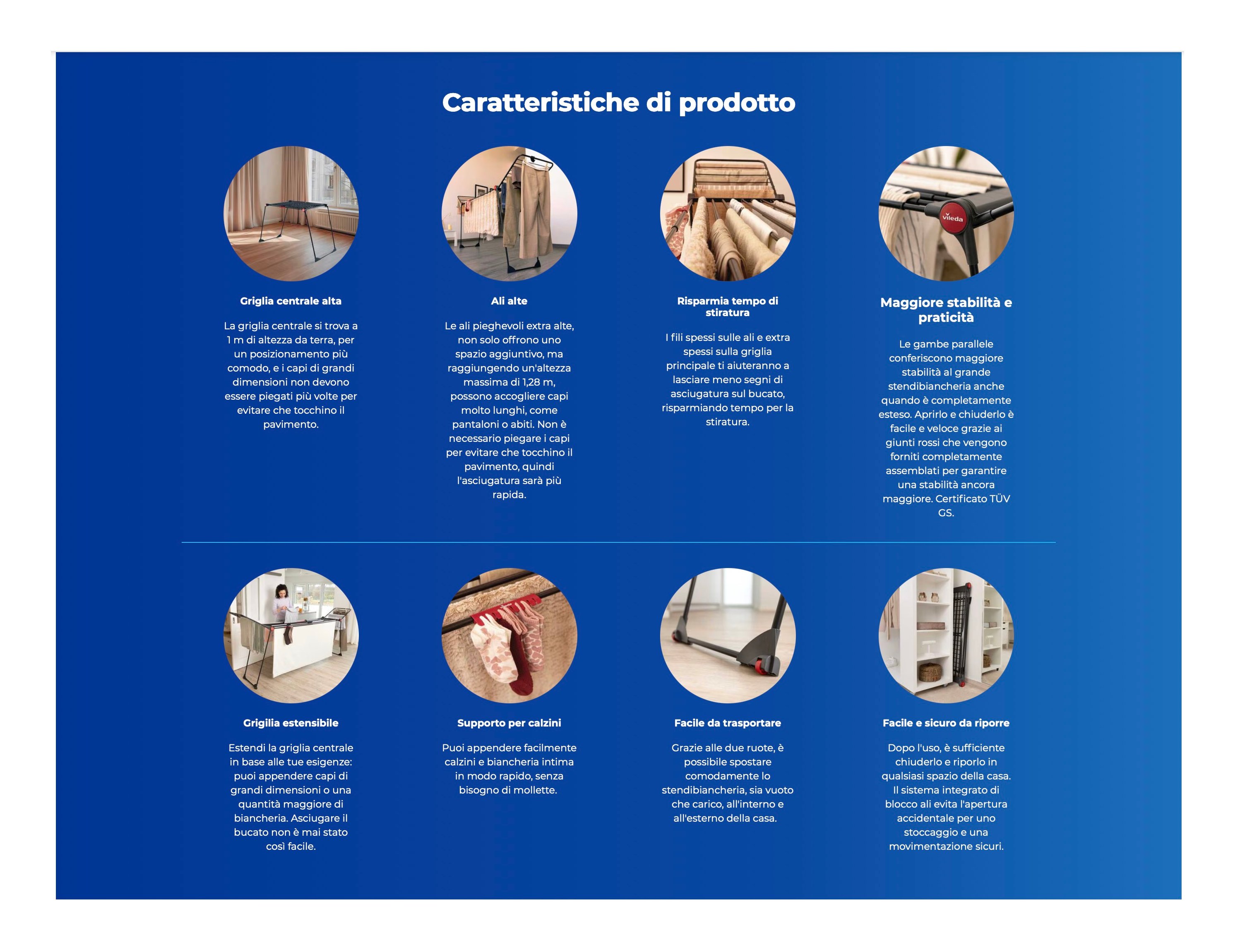 Vileda Infinity Flex Ultimate è realizzato in acciaio e alluminio. I suoi fili tubolari telescopici sono estremamente resistenti, duraturi e ultra-spessi. Grazie al loro spessore, i segni lasciati sul bucato sono meno numerosi e consentono di ridurre i tempi di stiratura. Le solide gambe parallele conferiscono allo stendibiancheria grande stabilità anche quando è completamente esteso e carico. I nuovi e pratici giunti sono assemblati completamente per garantire una stabilità ancora maggiore e assicurare che Infinity Flex si chiuda e si apra facilmente. Inoltre, evita chiusure accidentali.